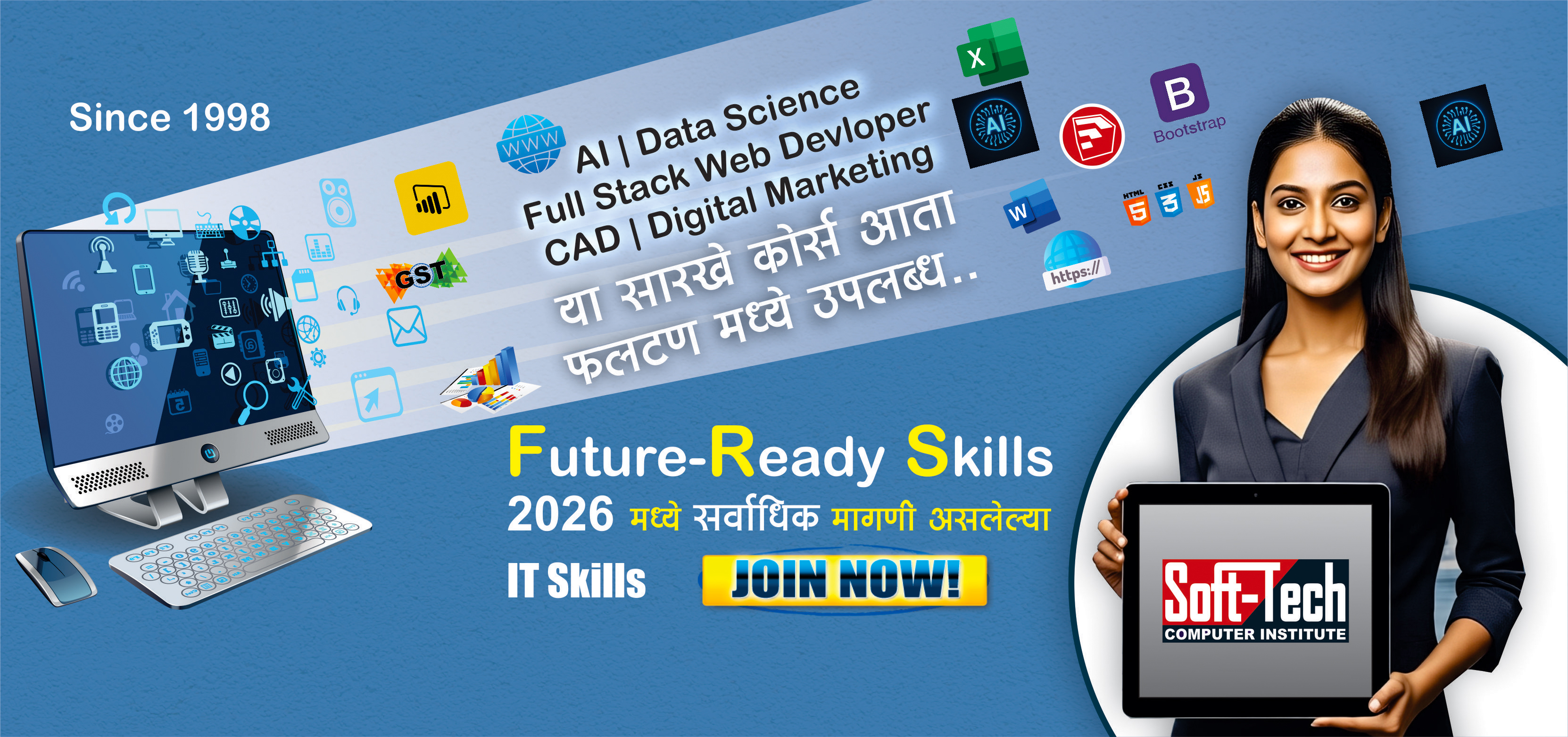 Soft-Tech Computer Institute Associated with (NIELIT (Govt. of India) for CCC, Digital India certified CSC ID 180272560018. ATC of AICPE (All India Council For Professional Excellence) ATC code –U243. Soft-Tech Phaltan is an ISO 9001:2015 Certified Training Institute